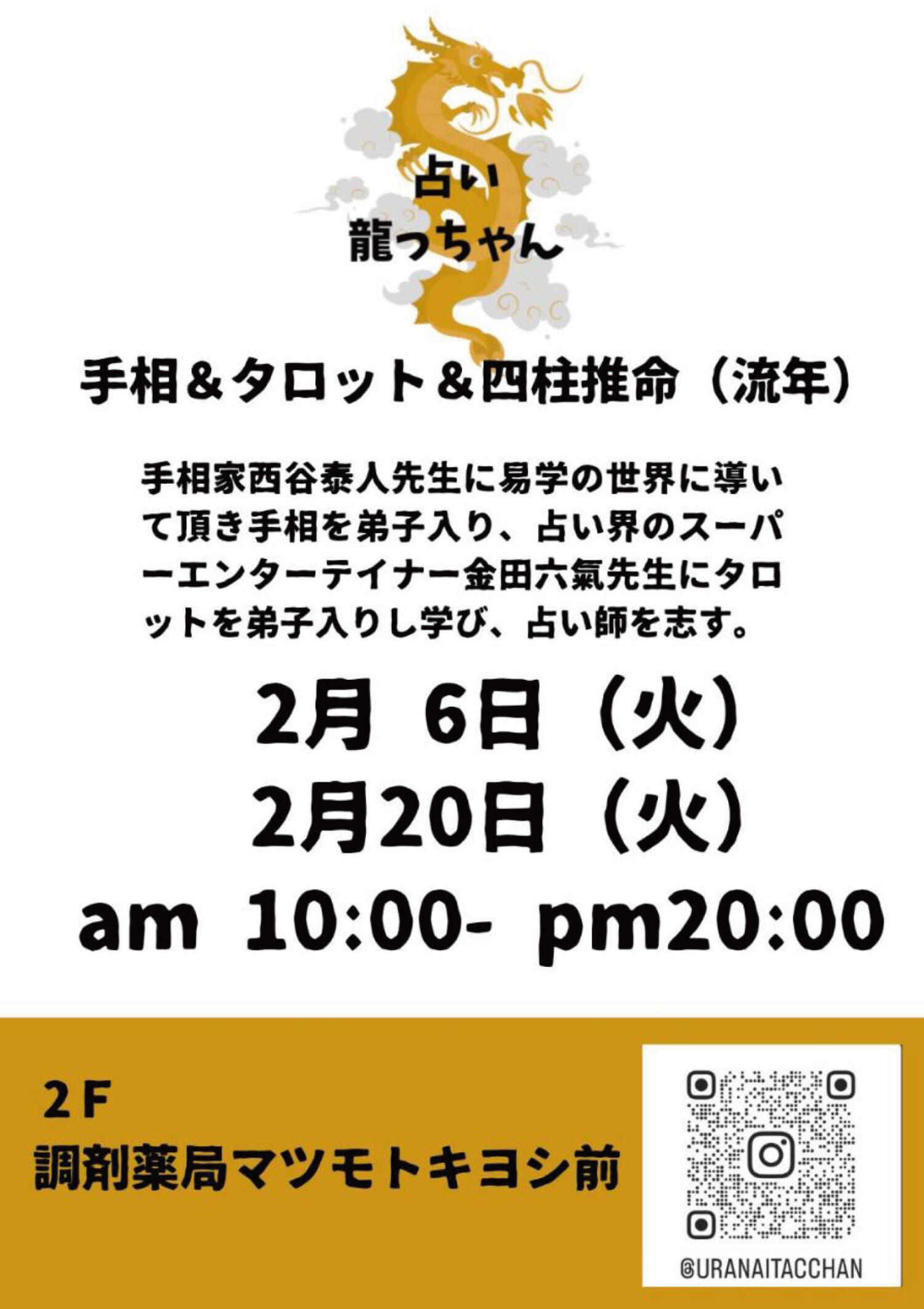 2階「調剤薬局マツモトキヨシ前特設会場」にて占い龍ちゃんによる「手相&タロット」を実施します!