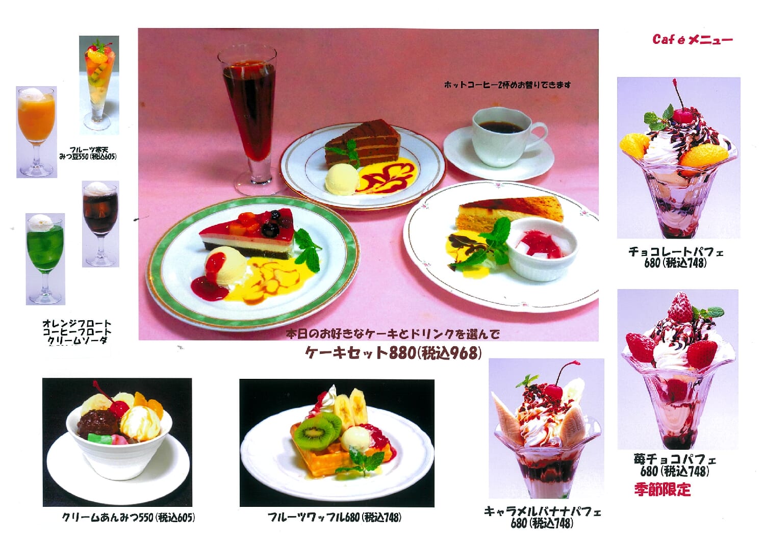 お好きなケーキとドリンクを選べるケーキセット(税込880円)やみんな大好きパフェ、クリームあんみつなど幅広いスイーツを提供しております。