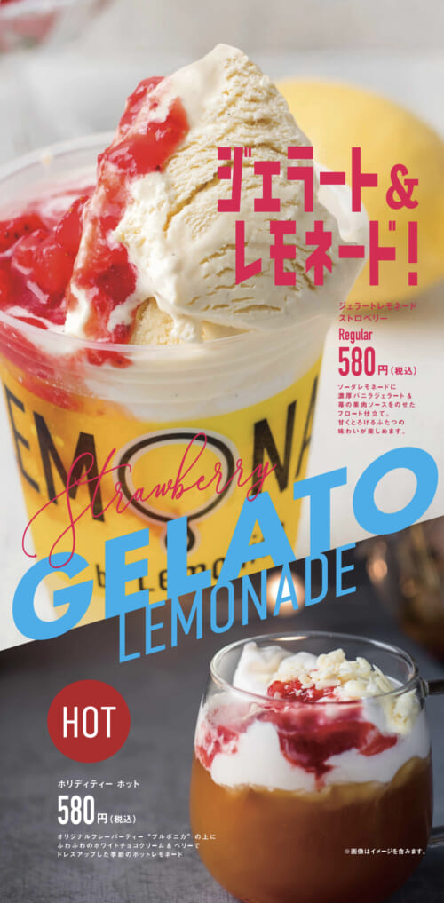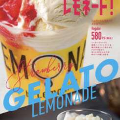 ソーダレモネードに濃厚バニラジェラートとイチゴの果肉ソースをのせたフロート仕立てのレモネード。