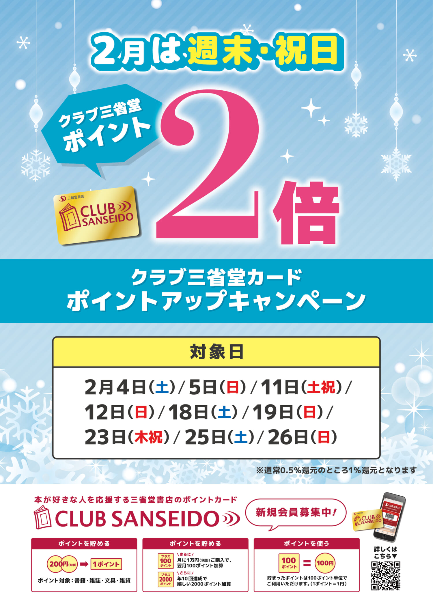 三省堂書店 2月の土日祝はポイント2倍キャンペーン 千城台OPC 3年前 「2月は土日祝がオトク!クラブ三省堂カードを土日祝にご提示頂きお買い物すると ポイントが2倍になります!この機会にぜひご来店くださいませ。」