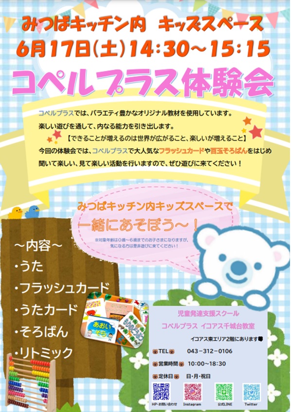 6月17日(土)14:30から、1階みつばキッチン内キッズスペースにて【コペルプラス体験会】を開催します!