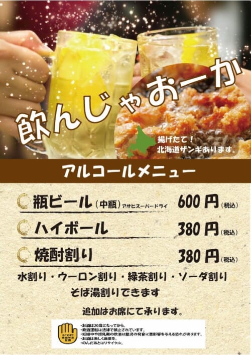 1F 美唄 そば 大地 アルコールメニュー 販売開始! 2023/10/31 更新 11/1よりアルコールメニューの販売を開始いたします。 瓶ビール、ハイボール、焼酎割りなど各種ご用意しております。 美唄そば大地のザンギや焼き鳥とご一緒にいかがでしょうか。 美唄 そば 大地 ショップ情報