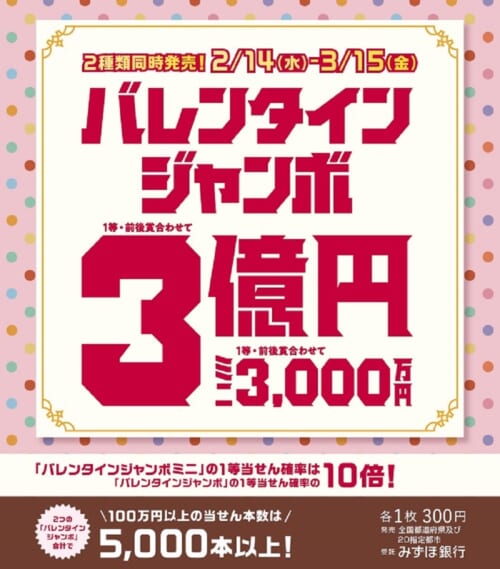 1等・前後賞合わせて3億円の『バレンタインジャンボ宝くじ』
