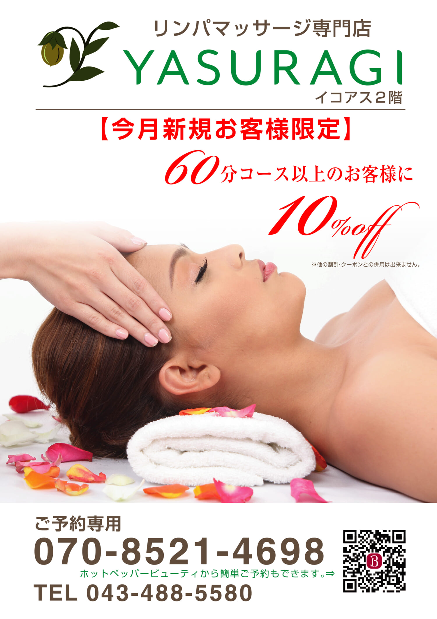 まだ【リンパマッサージ専門店YASURAGI】をご存知のない方の為に2月新規限定の10%割引を致します。